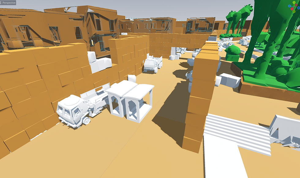 In this image, you can see the amount of buildings I can use within a map inside a level that had the originally planned scale for my level, forcing me to scope down a lot.